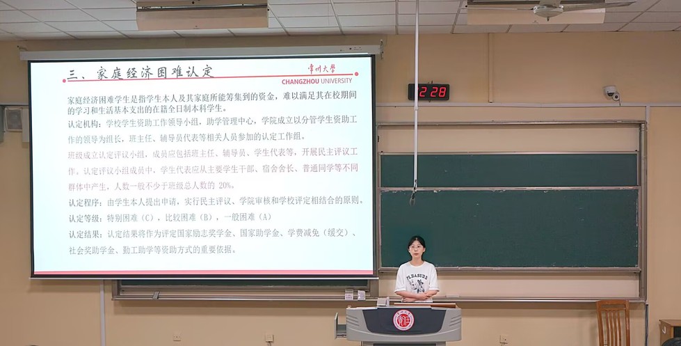 會議第二項議程,由輔導員何瑞玉為同學們進行資助政策解讀。何老師圍繞學生資助體系,詳細介紹了國家助學貸款、國家助學金、國家勵志獎學金、社會助學金以及學校各類專項資助項目的申請條件、流程和注意事項。她的講解細致全面,旨在幫助同學們清晰了解政策,徹底解除后顧之憂,決不讓經(jīng)濟問題成為求學路上的絆腳石,鼓勵大家放下包袱,專心學業(yè)。