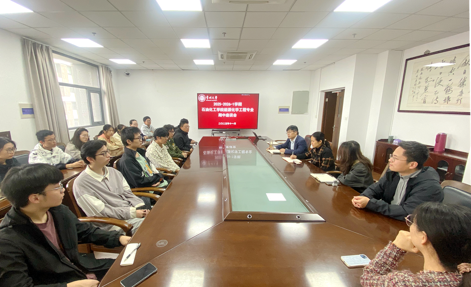 為全面了解教學(xué)動(dòng)態(tài),及時(shí)解決學(xué)生在學(xué)習(xí)過程中遇到的問題,進(jìn)一步提升教學(xué)質(zhì)量,2025年11月11日,我院召開了能源化學(xué)工程專業(yè)期中座談會(huì)。專業(yè)負(fù)責(zé)人任慶功、校督導(dǎo)黎珊、專業(yè)教師代表、學(xué)生代表參加會(huì)議。