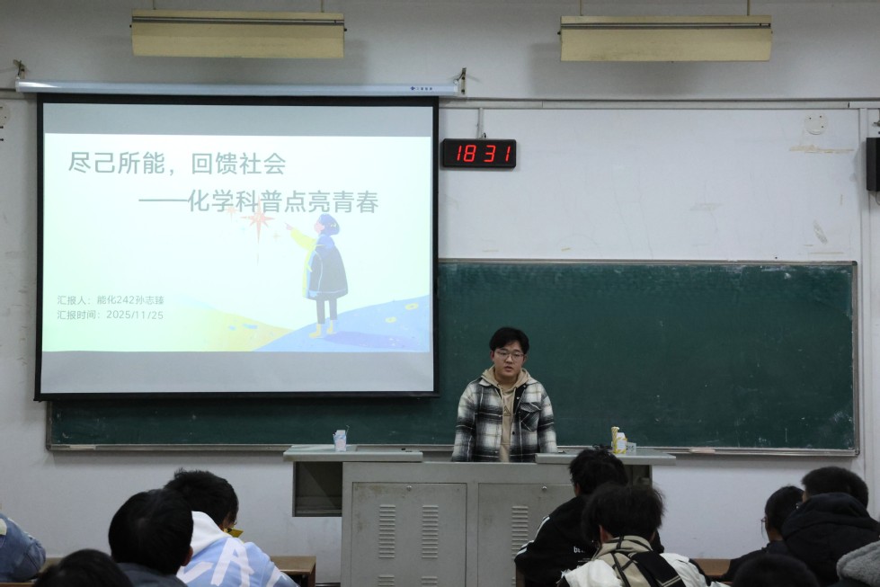 我院于11月25日在W1205教室成功舉辦了“石化青年說(shuō)”系列講座第三講。本次講座以“盡己所能,回饋社會(huì)”為主題,由能化242班孫志臻與化工246班宋羽凡擔(dān)任主講。