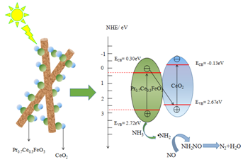 Rational construction of direct Z-scheme doped perovskite/palygorskitenanocatalyst for photo-SCR removal of NO: Insight into the effect of Ceincorporation Xiazhang Li *, Haiyang Shi , Xiangyu Yan , ShixiangZuo , Yuying Zhang , Qun Chen , Chao Yao *,Chaoying Ni*,Journal of Catalysis 369 (2019) 190–200 原文鏈接: https://www.sciencedirect.com/science/article/pii/S0021951718304391?dgcid=author 針對(duì)脫硝催化劑低溫活性差,抗硫抗水性弱,成本高的難題,本團(tuán)隊(duì)近年來嘗試將光驅(qū)動(dòng)引入傳統(tǒng)SCR催化脫硝體系,基于“固溶析出相”的理念,以天然凹凸棒石(坡縷石)為基體,相繼設(shè)計(jì)了Mn離子摻雜type-I型(ChemicalEngineeringJournal, 2017, 320, 211-221),Ni離子摻雜type-II型photo-SCR催化劑(Applied Catalysis B: Environmental,2018,231, 92–100),巧妙解決了光生載流子易復(fù)合的難題,并構(gòu)建了石墨烯介質(zhì)的間接Z-Scheme(Journal of Catalysis,2018,357,59–68),氮摻雜碳量子點(diǎn)修飾的直接Z-Scheme催化劑(ACS Sustainable Chem. Eng, 2018, 6,6, 10616?10627),解決了光生電荷遷移后氧化還原活性變差的難題。本工作在此基礎(chǔ)上,在鈣鈦礦中引入Ce離子,通過費(fèi)米能級(jí)的調(diào)控引導(dǎo)在凹凸棒石表面形成摻雜PrFeO3/CeO2直接Z-Scheme“固溶析出相”異質(zhì)結(jié),無須傳導(dǎo)介質(zhì),有效提升了光能吸收,保持了高氧化還原活性的同時(shí)表現(xiàn)出良好的低溫抗硫抗水性。該工作得到了國(guó)家自然科學(xué)基金(51674043)和江蘇省國(guó)際科技合作項(xiàng)目(BZ2015040)的資助,同時(shí)得到了美國(guó)特拉華大學(xué)電鏡中心主任倪超英教授的大力支持。