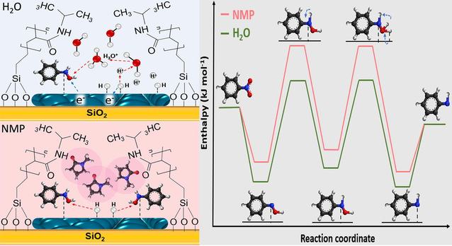 在前期研究聚合物對催化劑誘導的溶劑化效應的基礎上(ACS Catalysis 2023, 13, 10, 6590–6602,Top期刊,封面論文),中文解析見:https://mp.weixin.qq.com/s/6ZsBwg6RtE0h1wOAPhf3_w,黃鵬程博士與荷蘭特文特大學(University of Twente)Leon Lefferts, Jimmy Faria Albanese 教授合作,研究了液相加氫反應中溶劑(質子溶劑與非質子溶劑)對于修飾催化劑表面的聚合物的刺激響應性的影響,以及對于硝基苯加氫反應的反應速率,反應活化能,過渡態(tài)能量的影響。
