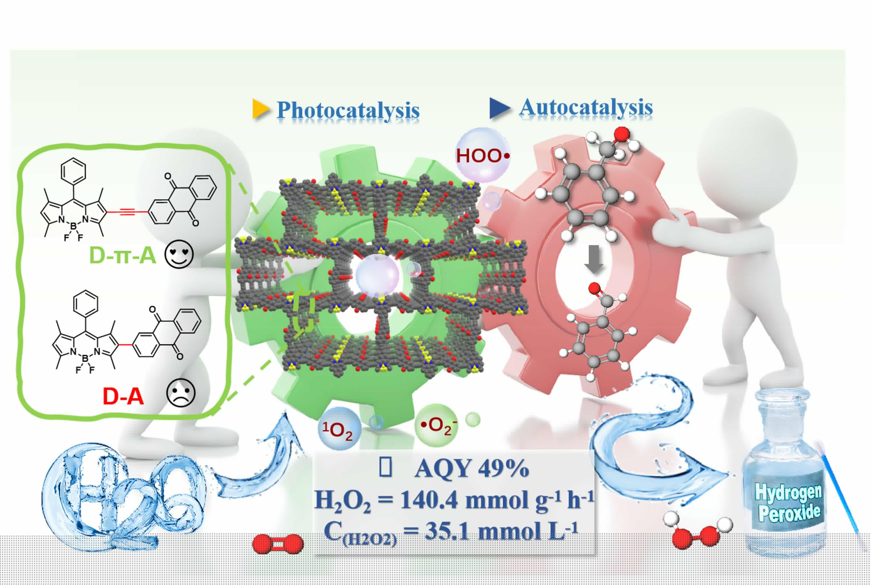 傳統(tǒng)蒽醌法生產(chǎn)過氧化氫(H2O2)因高能耗和環(huán)境污染問題備受關(guān)注,亟需尋找更高效、環(huán)保的替代方法。近期,顧培洋教授團(tuán)隊(duì)和路建美教授團(tuán)隊(duì)合作在人工光合作用生產(chǎn)H2O2領(lǐng)域取得重要進(jìn)展,開發(fā)出一種新型D-π-A型共軛多孔聚合物光催化劑,顯著提升了H2O2的生成效率,為可持續(xù)能源轉(zhuǎn)換和環(huán)境保護(hù)提供了新思路。