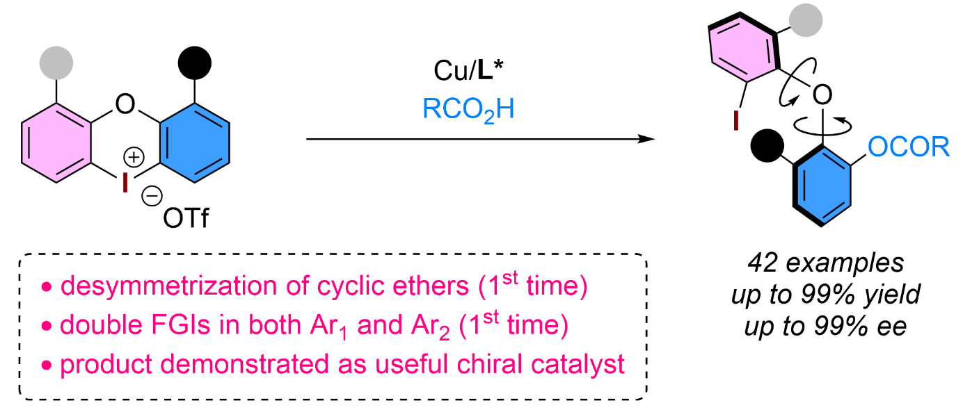 高效構(gòu)建軸向手性二芳基醚(ACDEs)是有機合成中一項重要且新興但極具挑戰(zhàn)性的任務(wù)?,F(xiàn)有基于去對稱化策略的成功案例僅限于非環(huán)芳基醚,且僅能對四個取代基中的一個進行單一修飾,模塊化程度較低。黃海和孫建偉課題組近日首次開發(fā)了一種雙取代基同步修飾的對映選擇性合成策略,實現(xiàn)了ACDEs結(jié)構(gòu)的靈活多樣化構(gòu)建?;诃h(huán)狀二芳基碘鎓鹽的開環(huán)反應(yīng),建立了一種溫和的銅催化方法,在溫和條件下實現(xiàn)了優(yōu)異的反應(yīng)效率、對映選擇性和良好的區(qū)域選擇性。所獲得的高對映體純度ACDEs產(chǎn)物可作為高效手性催化劑應(yīng)用于不對稱合成領(lǐng)域。
