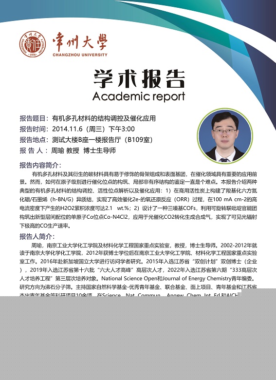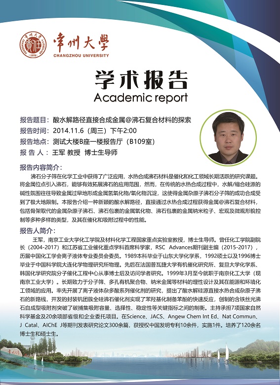 | 【學(xué)術(shù)報(bào)告】11月6日學(xué)術(shù)報(bào)告—王軍教授、周瑜教授 南京工業(yè)大學(xué) |